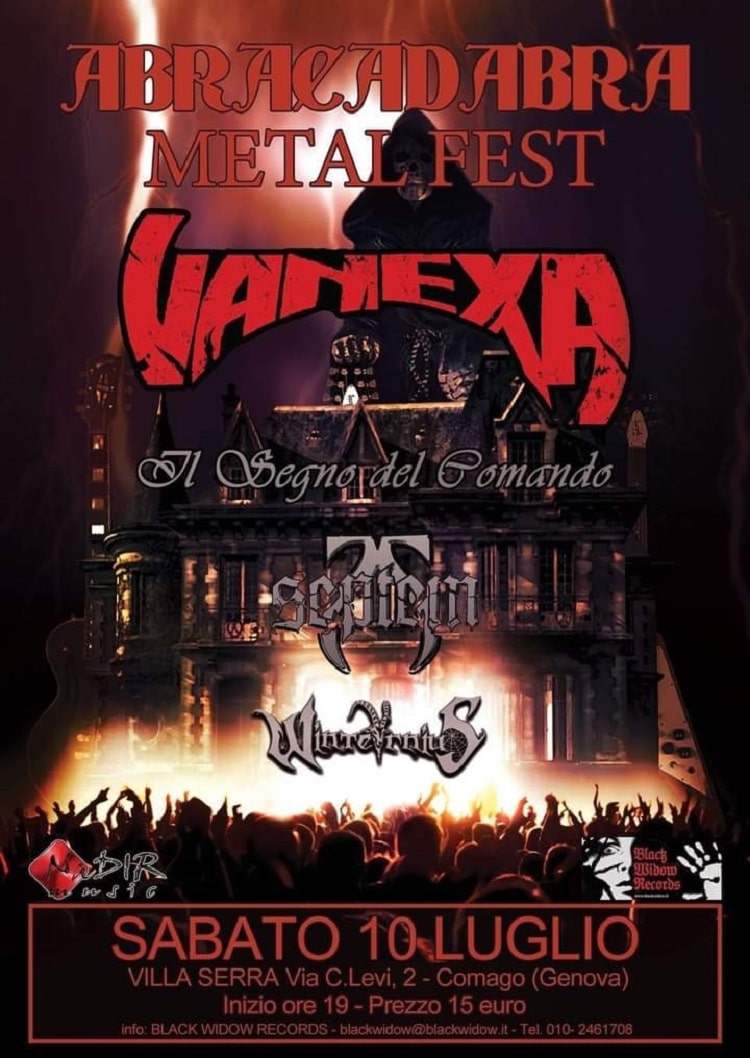 L’evento è inserito nel terzo ABRACADABRA FESTIVAL che quest’anno sarà di 2 giorni (10 e 11 Luglio), dopo il grande successo delle prime due edizioni che gli scorsi anni hanno registrato più di 4000 presenze ogni volta. Villa Serra, con i suoi 9 ettari di verde, laghetti e costruzioni neogotiche, è un meraviglioso “pezzo di Inghilterra” trasportato a Genova e per questo è la perfetta location per la musica rock che quest’anno sarà protagonista sull’ampio palco della manifestazione. Si inizierà a suonare alle 19:00 con i WINTERNIUS, genovesi nati dalle ceneri dei Sacradis, autori di un black metal potente e ricco di variazioni verso il thrash e l’heavy più classico. Presenteranno i brani dal loro album “Open the Portal”, edito per la Black Tears. Seguiranno i SEPTEM, band formatasi nel 2003 a La Spezia, con il loro speed/thrash metal moderno ma con richiami anche all’hard rock classico. Poi IL SEGNO DEL COMANDO, gruppo che col tempo ha raggiunto livelli elevatissimi, tanto da essere adorato e seguito da fans di tutto il mondo grazie ad uno stile oscuramente unico tra dark rock e metal progressivo e che per l’occasione, oltre al repertorio classico, presenterà alcuni pezzi nuovi facenti parte di futuri progetti in fase di realizzazione. Sarà quindi un’occasione unica per ascoltare delle anteprime assolute. A chiudere la serata i mitici VANEXA, la prima heavy metal band italiana, che presenterà il nuovo album “The Last in Black” pubblicato da Black Widow Records. Il disco sarà disponibile anche in una Limited Edition in vinile e la band sarà a disposizione dei fans per un firmacopie. Siete dunque invitati ad arrivare il prima possibile anche per visitare questa splendida villa e vivere una bella giornata tra stand gastronomici, esoterici, medioevali, cartomanzia, dischi, ecc. Insomma… Ci sono tutti gli ingredienti per una giornata indimenticabile, incluso il prezzo di ingresso assolutamente politico ed invitante di soli 15 €. Vi aspettiamo!