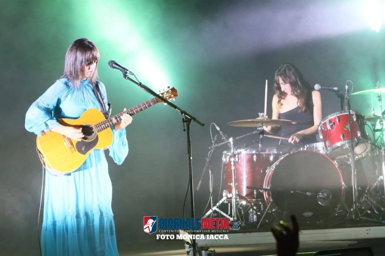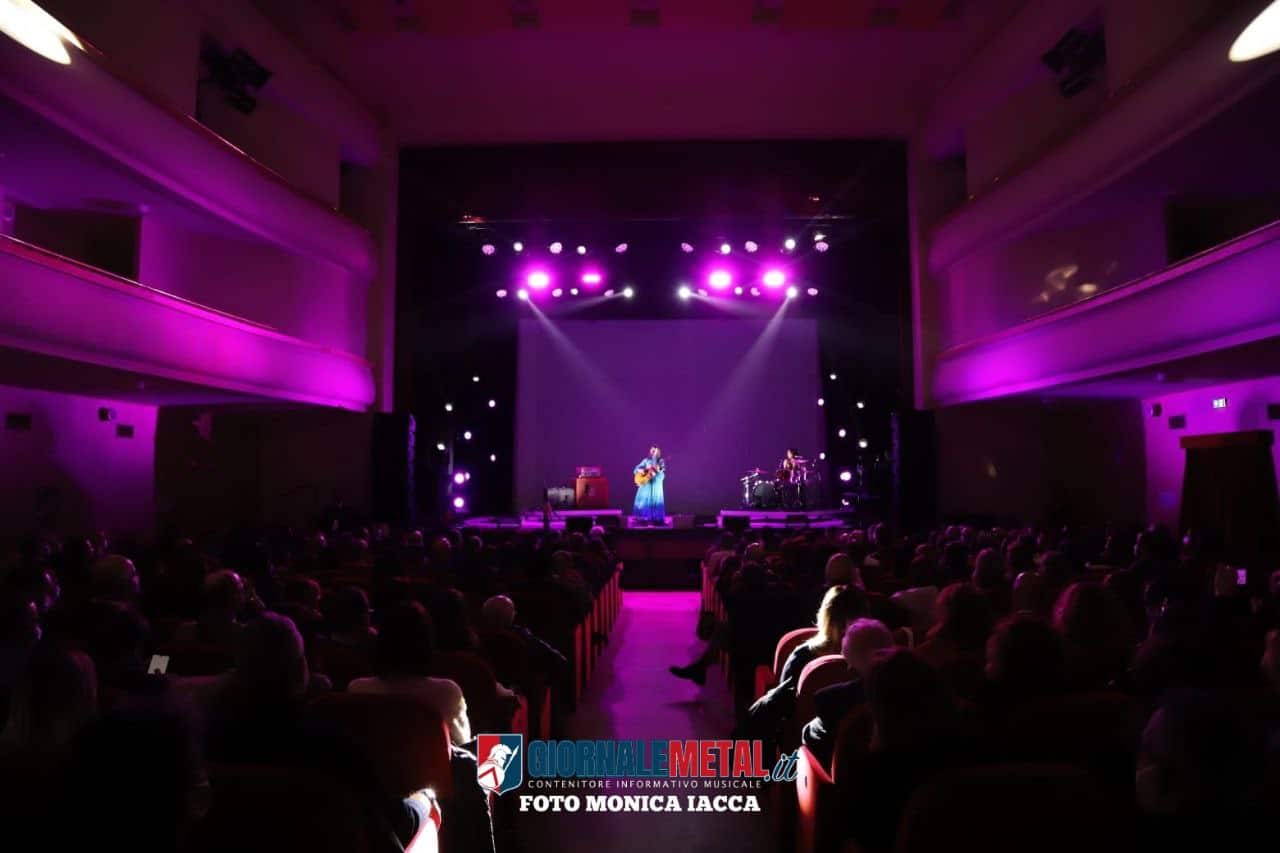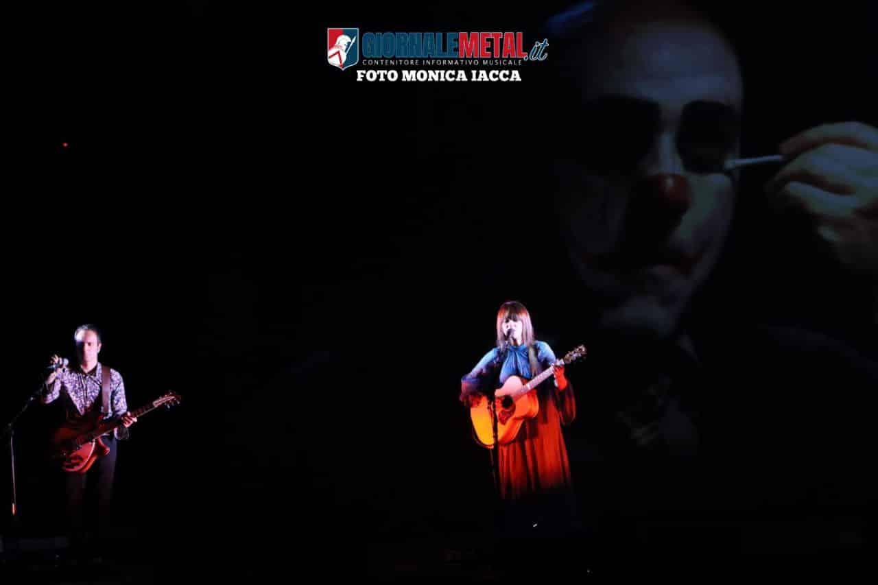 Il secondo atto “Gli anni mediamente isterici” ha un’impronta decisamente rock, mista all’elettronica. Carmen Consoli mostra una grinta graffiante perfettamente in sintonia con Marina Rei che l’accompagna alla batteria. Marina è anche la voce principale nel brano: “Donna che parla in fretta”. I ritmi si fanno incalzanti, le luci forti ed intermittenti, il fumo scenografico invade il palco e qualcosa fa scattare l’antincendio. Una sirena copre la musica mentre una voce metallica impartisce indicazioni su come evacuare il teatro. Ovviamente si è trattato solo di un simpatico fuori programma che ha vivacizzato l’ambiente senza che accadesse nulla di imprevisto.