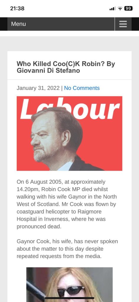 Nel 2022, Giovanni Di Stefano pubblicò un articolo intitolato “Who Killed Cook Robin?”, in cui metteva in discussione le circostanze della morte dell’ex Ministro degli Esteri britannico Robin Cook e del presidente serbo Slobodan Milošević, suggerendo che entrambe le morti non furono naturali, ma omicidi di Stato mascherati da fatalità. La tesi centrale di Di Stefano è chiara: sia Milošević che Cook erano uomini troppo onesti e troppo scomodi per i poteri forti. Entrambi conoscevano troppe verità e avevano deciso di parlare.