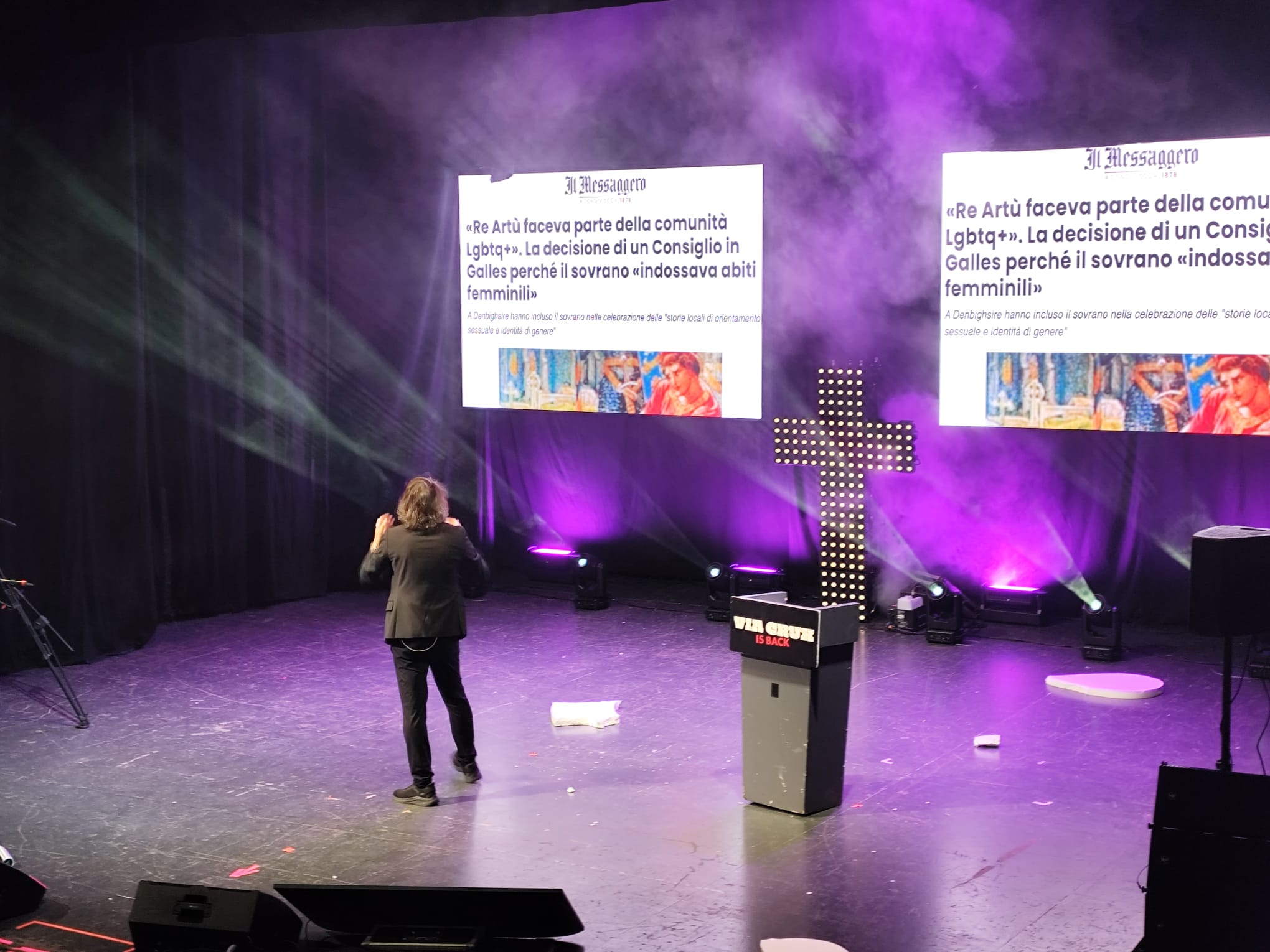 La serata si è conclusa con un applauso convinto, segno di un pubblico coinvolto e soddisfatto. Via Crux all’Orfeo ha offerto un percorso tra attualità, costume e riflessioni personali, condotto con energia e un equilibrio che ha sorpreso anche chi si aspettava un’impostazione più dura. Un appuntamento che ha confermato la capacità di Cruciani di unire provocazione e misura all’interno di un racconto scenico solido e ben costruito.