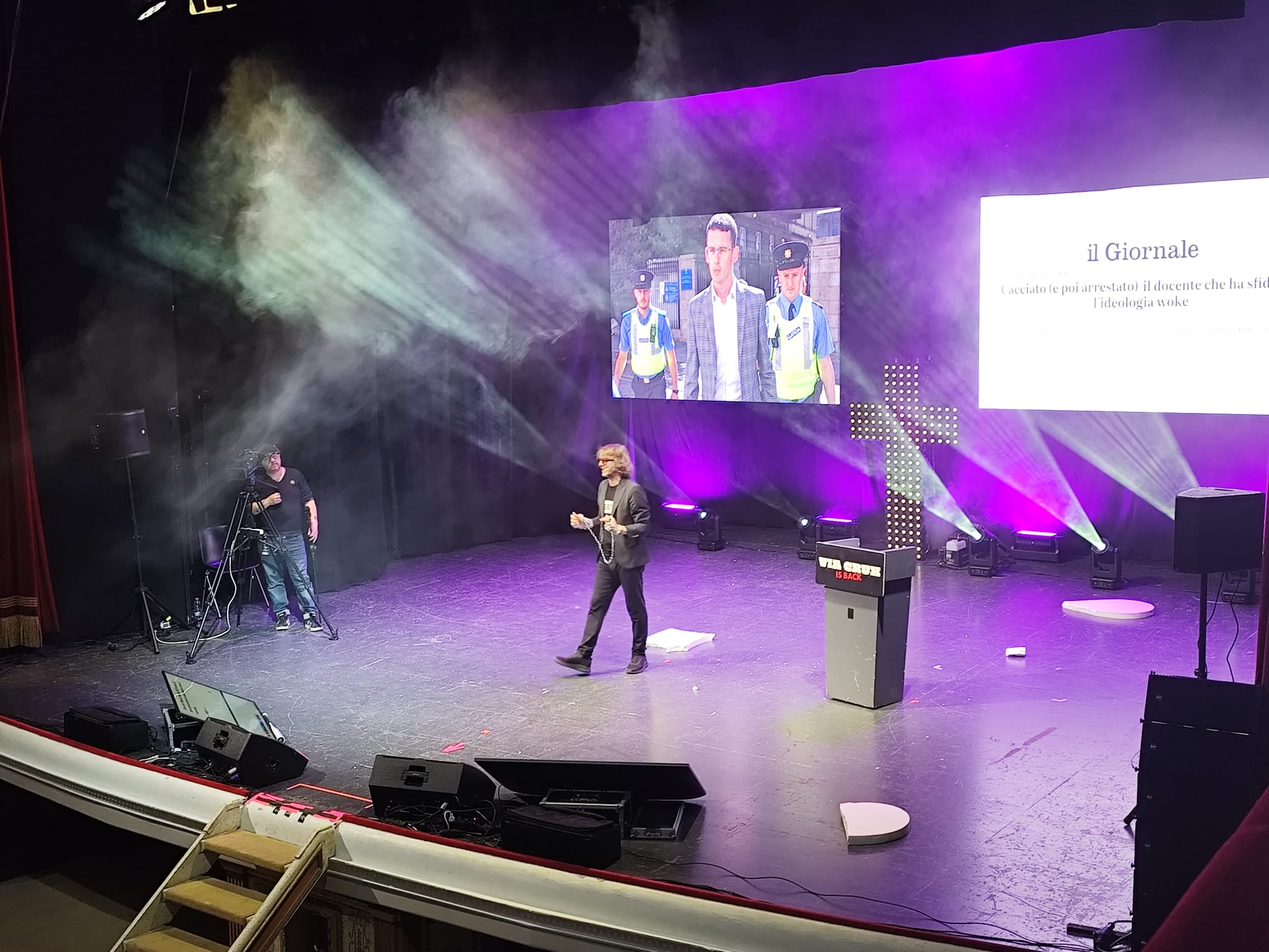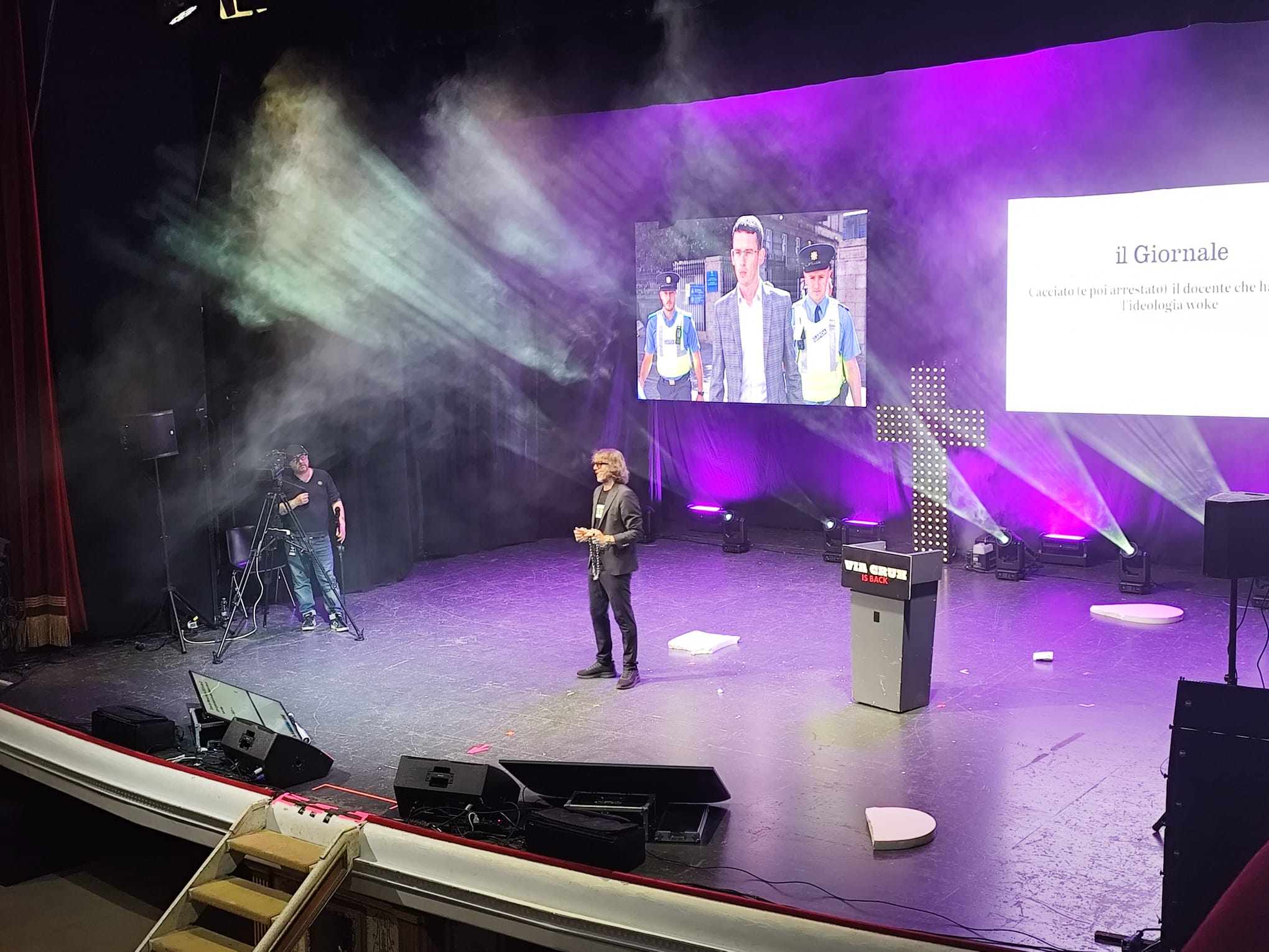 Via Crux, lo spettacolo di Giuseppe Cruciani, è approdato al Teatro Orfeo offrendo al pubblico tarantino una serata densa di contenuti, ritmo e analisi dell’attualità. La sala non ha registrato il tutto esaurito, un dato comprensibile considerando che il format si muove su tematiche spesso percepite come più vicine a un’area culturale conservativa, e dunque non immediatamente trasversale. Ciò non ha impedito allo spettacolo di svilupparsi in un clima attento, partecipe e rispettoso.