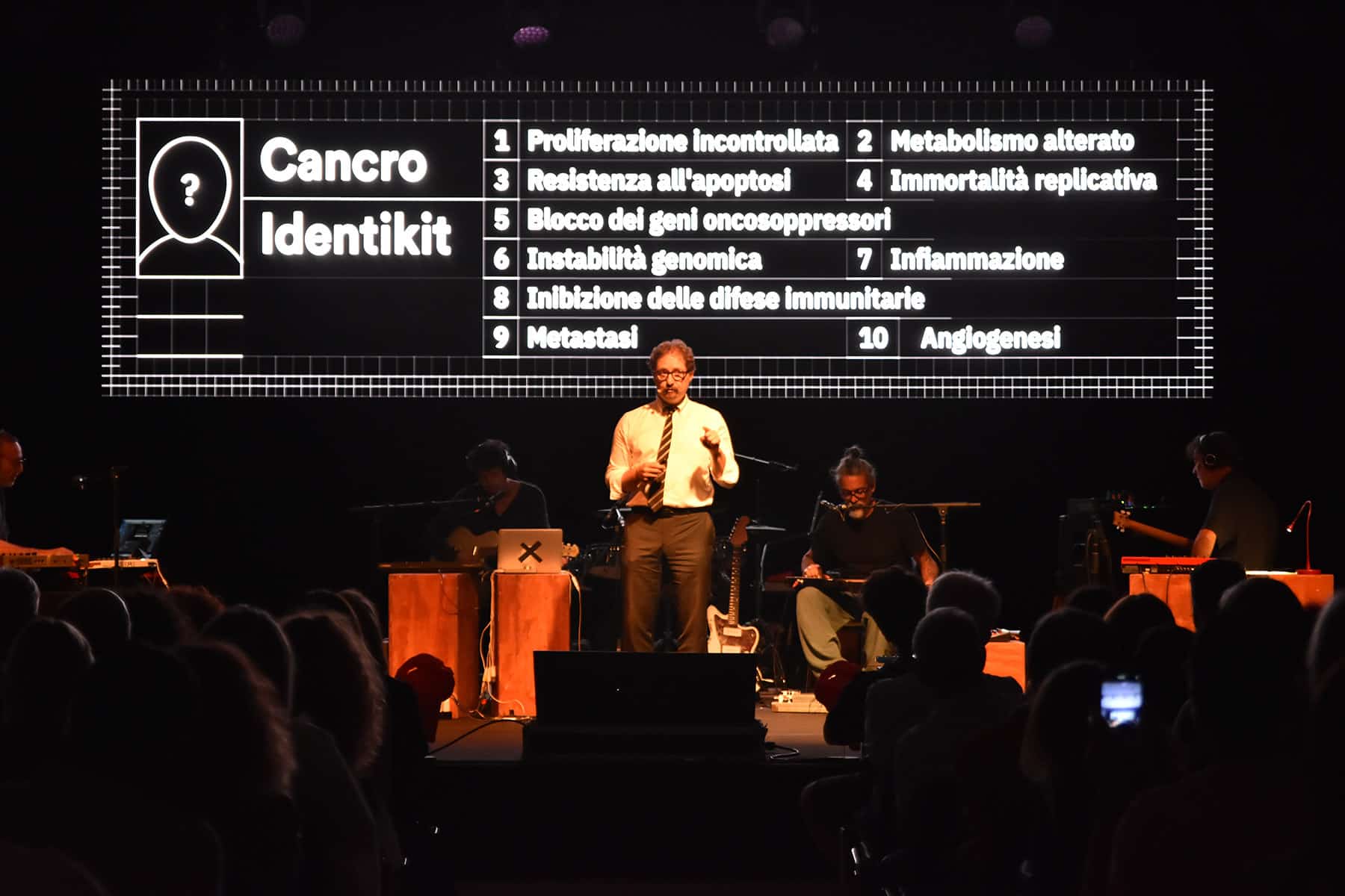 Il gruppo ha musicato “DNA”, brani inediti, immagini suggestive e una scenografia costruita per rendere spettacolare la conferenza scientifica del filosofo, romanziere ed evoluzionista Telmo Pievani, che ha ripercorso la storia del genere umano dall’Homo Sapiens fino alle ultime conquiste della genetica.