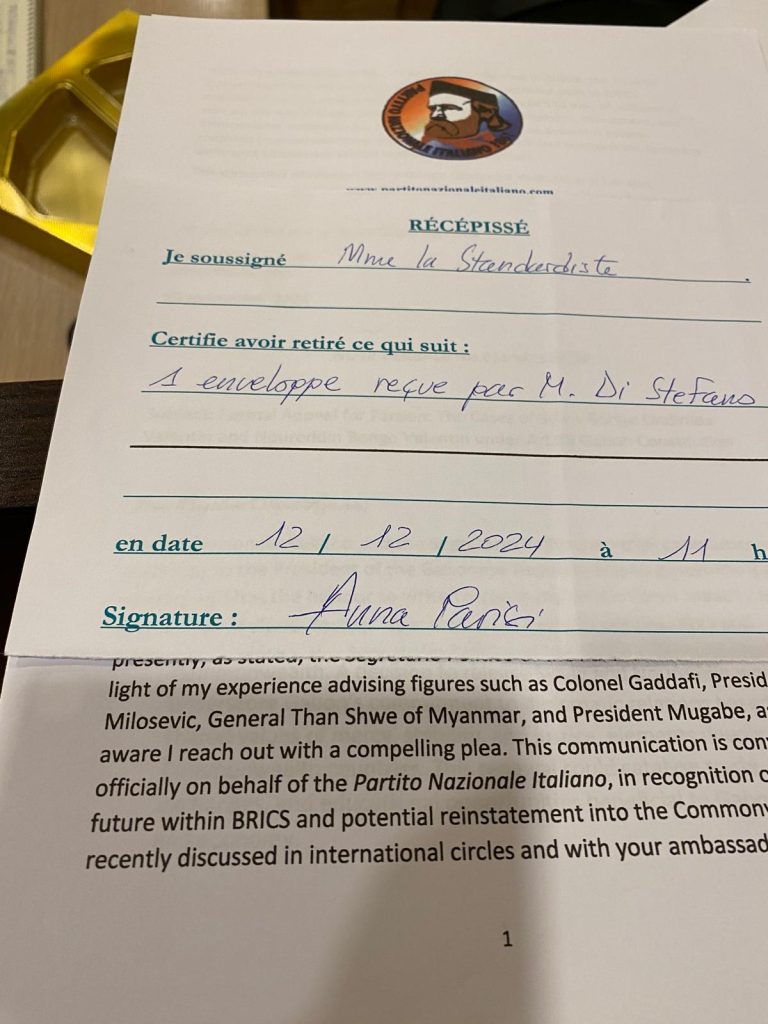 In una lettera indirizzata all’Unione Africana, Di Stefano scrive: