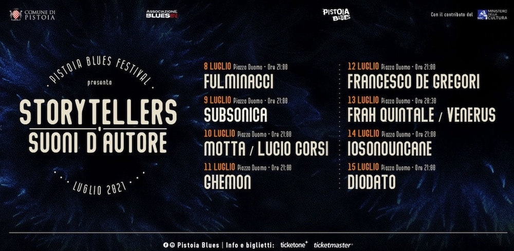 “Storytellers – Suoni d’Autore” è la rassegna che animerà il mese di luglio in Piazza Duomo a Pistoia. Una rassegna incentrata sull’esplorazione dei tanti linguaggi che la musica italiana ha sviluppato negli ultimi quarant’anni per raccontare storie ed emozionare il pubblico. In particolare i concerti in programma presentano autori di canzoni tra mainstream, rock, indie, rap e soul, tra vari stili e diversi approcci generazionali.