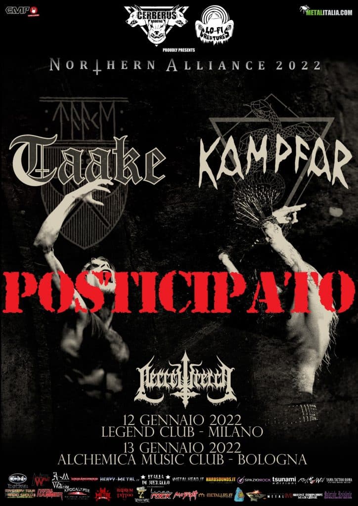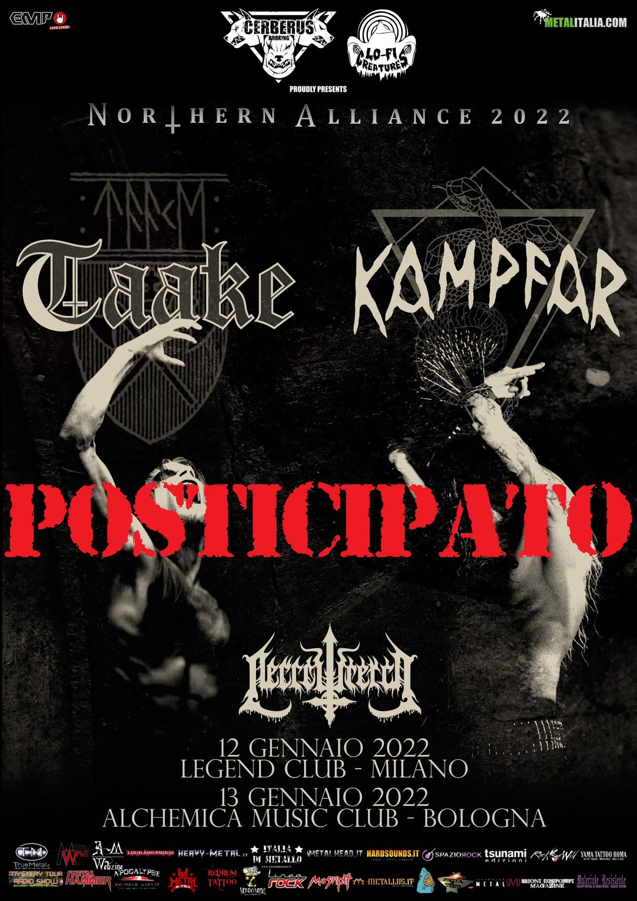 A causa del protrarsi dell’emergenza sanitaria globale a delle normative che regolano la musica dal vivo in materia di Covid-19 all’interno della comunità europea, il tour di TAAKE e KAMPFAR, comprese le date previste a Milano e Bologna, è da considerarsi posticipato a data da destinarsi.